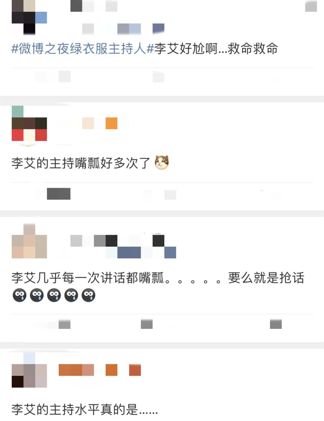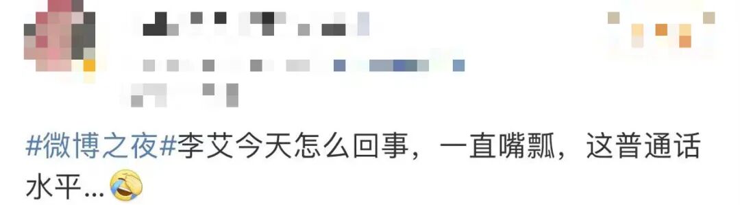 李艾主持微博之夜多次嘴瓢抢话,眼睛被网友吐槽睁不开! 中播网 内地女星 2023-03-26 10:38:14 366 创作不易,用心坚持,欢迎请BaGua喝几杯爱心咖啡!打赏并支持本文 打赏并删除本文 昨晚(3月25日)微博之夜荣誉盛典的主持人是尼格买提,李艾,司雯嘉。三位主持人不是第一次合作主持微博之夜了,此前2020微博之夜荣誉典礼的主持人也是尼格买提,李艾,司雯嘉。不过昨晚李艾主持微博之夜的表现引发了网友的热议。点击播放视频△首先是李艾主持时的眼睛,直播时,李艾无论是单独主持还是搭档尼格买提或者司雯嘉主持时,笑起来眼睛总是眯成了一条线。众多网友纷纷吐槽:“李艾的眼睛是睁不开嘛”、“李艾笑起来眼睛都眯没了”、“李艾的眼睛去哪儿了”、“李艾的眼睛确定能看到人吗”。除了眼睛,李艾整场晚会的主持表现也引发了网友的吐槽。点击播放视频△李艾整场主持多次失误,嘴瓢、抢话被网友吐槽。网友调侃如果是在央视播,错一次扣200块的标准,她整场的劳务费要被扣完,网友:“嘴瓢扣钱的话,李艾今晚倒贴”、“李艾今晚的主持人费用是不是可以不用给了,一直在嘴瓢”。李艾在念获奖作品《与君初相识·恰似故人归》时,大家来感受下↓点击播放视频△李艾,1979年1月4日出生于广东省广州市,1999年,正在上大三的李艾参加了福特世界超级模特大赛,获得中国区总冠军。2002年推出个人首支单曲《我喜欢我自己这样》,随后开始主持生涯。2010年主持江苏卫视谈话类节目《幸福晚点名》,2012年担任BTV文艺频道《我爱我家》节目主持人。2014年主持互联网首档穿搭互动时尚节目《亲艾的衣橱》。多次参与微博之夜的主持工作。在《妻子的浪漫旅行》中,李艾化身室内主持人。在一场晚会中,主持人是控制整场晚会的核心人物,当晚会开始,整台晚会的衔接,节奏都需要主持人把握,同样,出现了问题,也需要主持人应对。所以,一场直播大型晚会最能体现一个主持人专业素养。说说你对李艾昨晚主持的看法?☻ 本文由中国播音主持网原创,未经允许,禁止转载粉丝群聊/ 添加客服微信号:byzc2003 →备注“入群”设置星标/ 点右上角查看官方账号→设置星标?央视新闻主播出镜率调整,他们获重点培养 创作不易,用心坚持,欢迎请BaGua喝几杯爱心咖啡!打赏并支持本文 打赏并删除本文 感谢您的支持鼓励,我会继续努力的!文章地址:用户邮箱:打赏金额:USDT 请输入数字点击”去打赏“,即可进行打赏支持本文章哦 李艾 发表评论