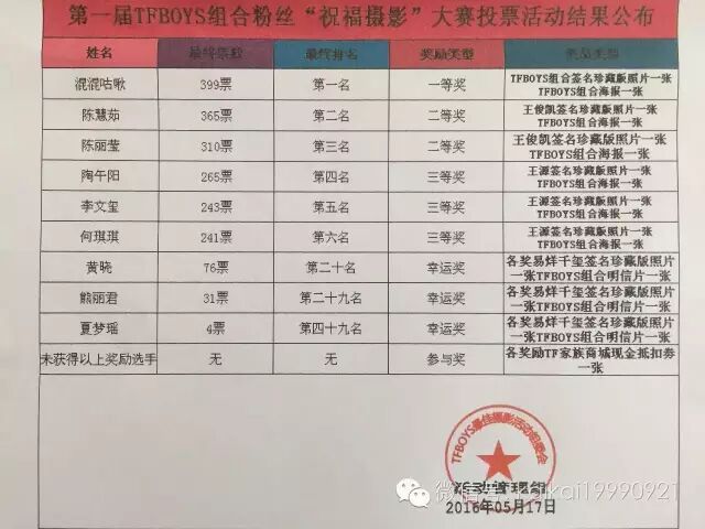 第一届TFBOYS组合粉丝“祝福摄影”大赛评选活小组在为期两天的投票统计中,完成了各项票数的统计及幸运奖的抽选,现将结果公开公布,请大家监督.