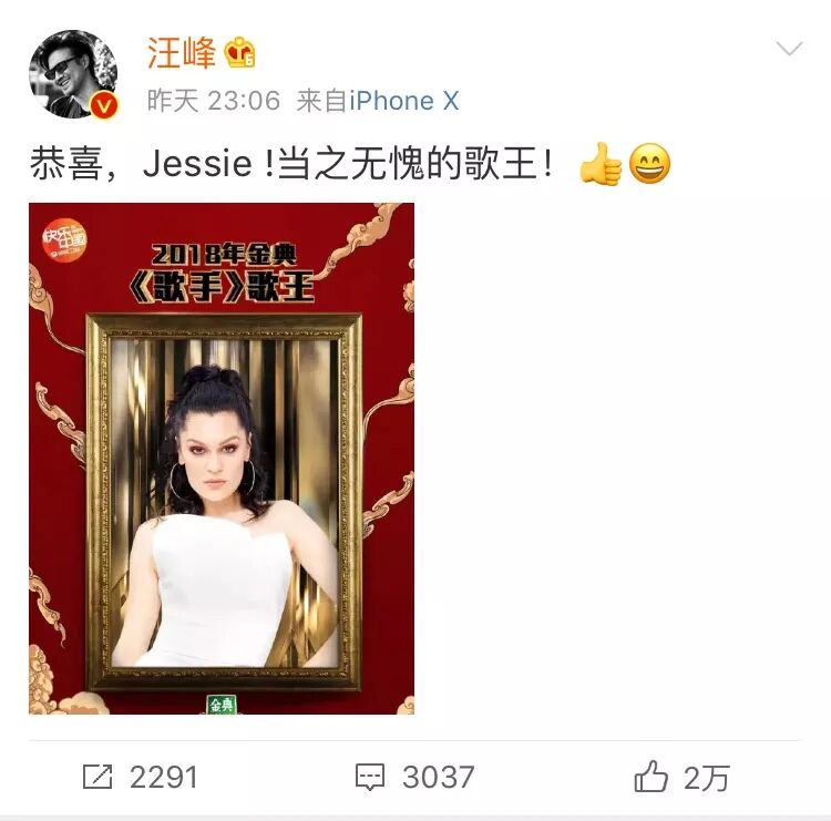 昨天《歌手》总决赛终于落下了帷幕,Jessie J成为了《歌手》历史上首位外籍歌王。汪峰也在微博上发出祝福,说Jessie是当之无愧的歌王。