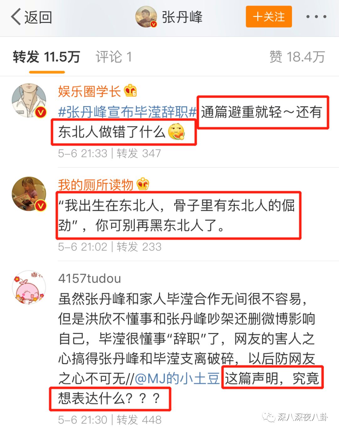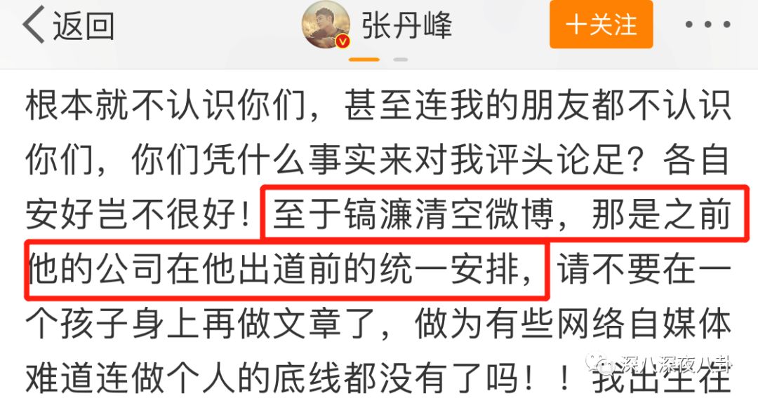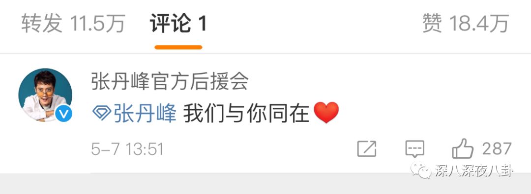 他把微博评论关了,这条几千万阅读的微博下只有一条来自“张丹峰官方后援会”的评论↓ “我们与你同在”