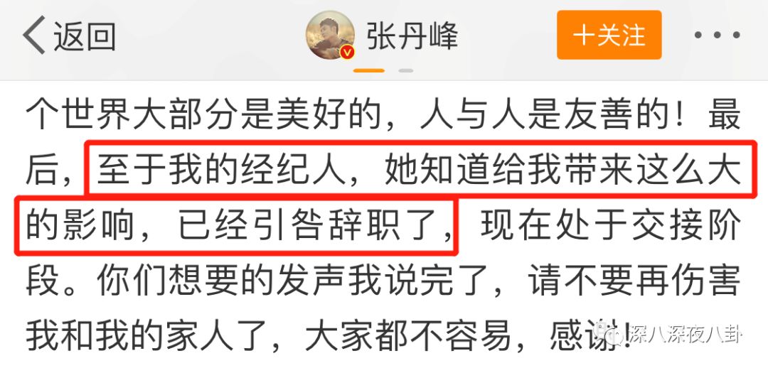 昨天晚上,张丹峰终于正面回应了此前的出轨传闻,宣布经纪人毕滢已引咎辞职。