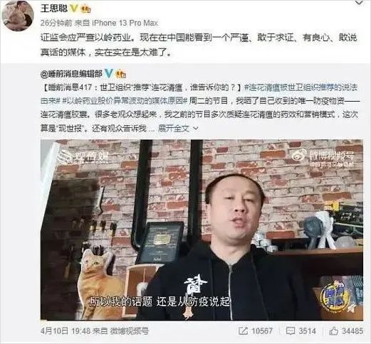 或许是两个信息的先后发布与近日连花清瘟治疗新冠肺炎的宣传,最后便成了王思聪转发视频的原因之一。