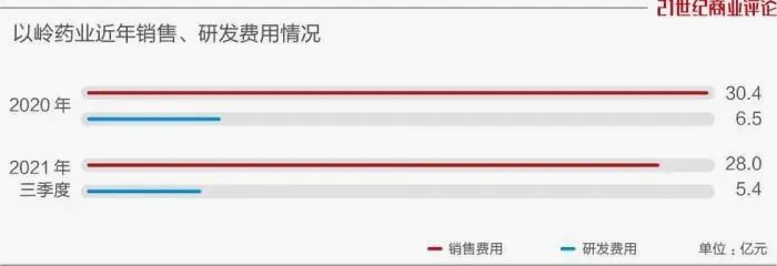 2020年,以岭药业的销售费用30.4亿元,占总成本41%,同比增长36.29%。2021年三季度,销售费用28亿元,占总成本42%,同比增长36.48%。相比之下,2020年的研发费用仅6.5亿元,2021年三季度研发费用仅5.4亿元。