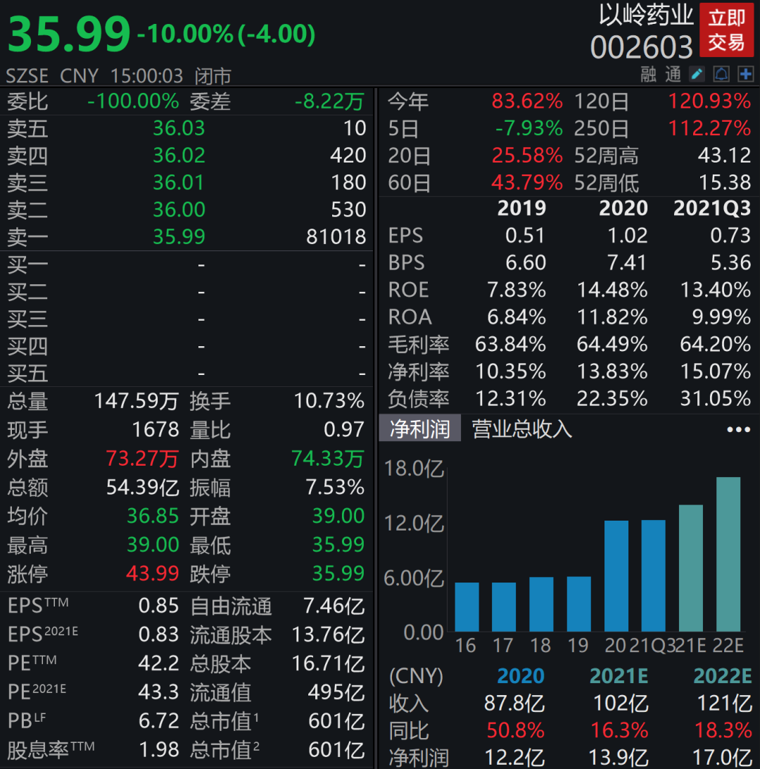 4月18日上午,以岭药业又一次跌停。截至下午四点,以岭药业跌停封单超45万手,近5日公司股价最高跌幅超23%。而此前,以岭药业是炙手可热的翻倍大牛股,自2021年底启动以来,以岭药业最高涨幅超160%。