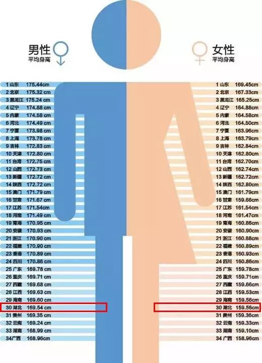 之前网上还有一份“中国各省男女平均身高表”,在排名的34个省区市中,湖北男女都在倒数第五。女性的平均身高为159.56cm,当然这份数据表没有出处。