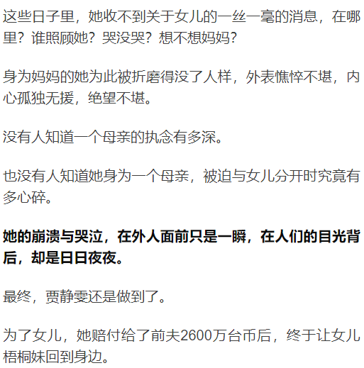 “伤横累累”的贾静雯没能全身而退,迎接她的是与前夫长达三年的争女之战。