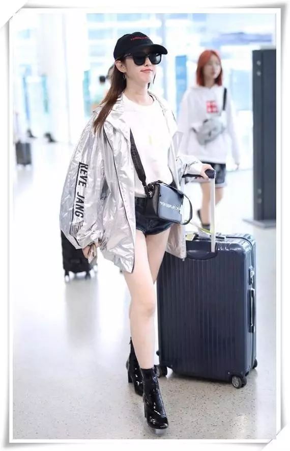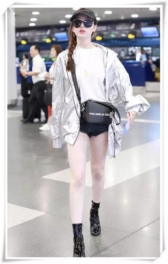 白色t恤简单自然,清爽干净,外搭一件银色的防晒服,简直帅到没朋友,斜挎一个黑色小包,精致有型,不过看着这裤子好像有点儿紧啊有木有?而且把腿都显粗了。