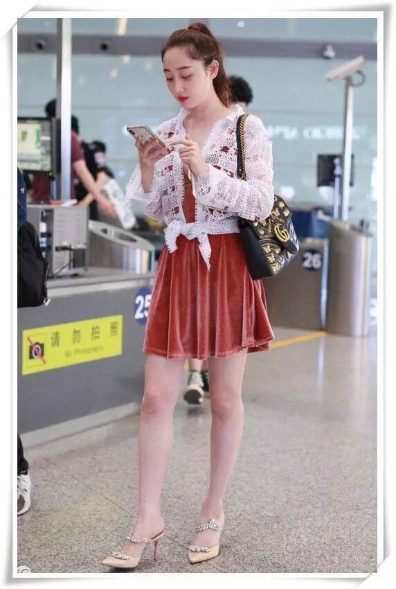 蒋梦婕的私服也是非常好看的,现身机场的她身穿一件深色的连衣裙,非常的显肤色,外搭一件蕾丝材质的外衣非常的好看,将下摆打结,拉高腰线,也提高了整体比例,脚踩一双黄色高跟鞋女人味十足