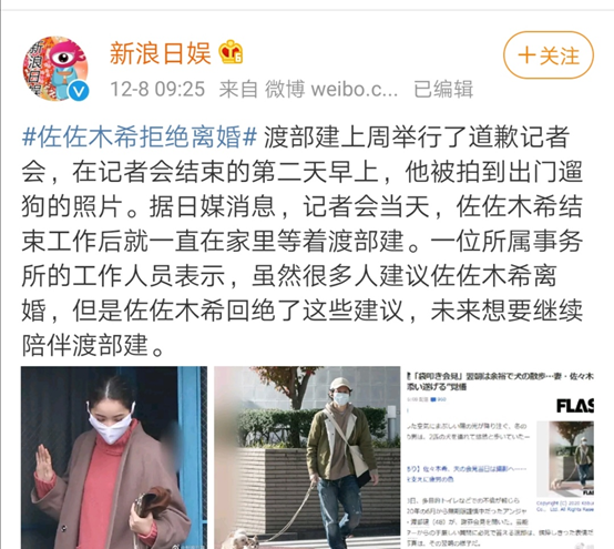 除此之外,对于大家关心的婚姻状况,渡部建表示称决定不会与佐佐木希离婚,“仍在努力重新获得妻子的信任”。