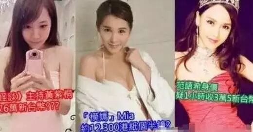 香港有线电视节目《怪谈》女主持黄紫桐也榜上有名,每1.5小时索价约1.4万港元(约11000人民币);拍过《喜爱夜蒲3》的香港嫩模何沅瞳,2小时价钱高达3万港元(约24000人民币)。