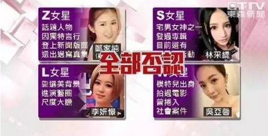 据了解,疑似是字母“Z、S、L、W”4名女星,而万能的网友根据新闻描述的特点对号入座,猜测四位字母女星分别是郑家纯,林采缇,李妍憬和吴亚馨,不过四位当事人全部否认。
