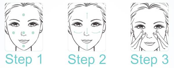 首先,咱们将精华均匀点涂在额头、两腮、鼻子、下巴五处。然后,用指尖均匀推开至全脸。最后,用指尖轻压按摩帮助吸收。