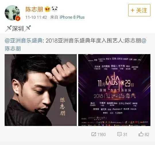 当然了,陈志朋以自己独特的方式在自己的事业道路上发展,是有他自己的原因和理由的,既然选择了这样的方式,相信也是最适合他的方式,毕竟每个人付出的方式不一样,有些人可能就是容易打动人心,而有些人的方式可能就有点突出,但还是希望我们观众以客观的角度去看待一个明星。毕竟身为一个公众人物,很多事情都有局限性,但是看陈志朋的社交平台上更新的内容,我们会发现他还是有自己的生活追求,今天才刚飞去深圳参加2018亚洲音乐盛典年度入围典礼,希望他以后的道路会越来越好吧!