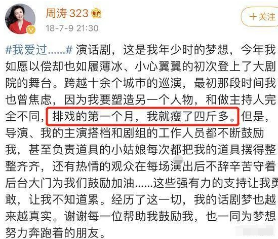 作为主持人多年来她一直都在优秀的道路上越走越远,在人生到达一个阶段之后,周涛也想要挑战一下自己多年来的另一个梦想,那就是话剧演员。