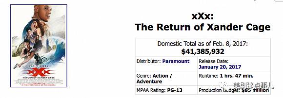 具体到《极限特工3》,由于中国公司往总投资额1.7亿美元的电影中注入了35%的资金,影片开头自然而然出现了两家公司的logo。事实上,这一成本远超IMDb及boxofficemojo等美国网站预估的8500万美元。