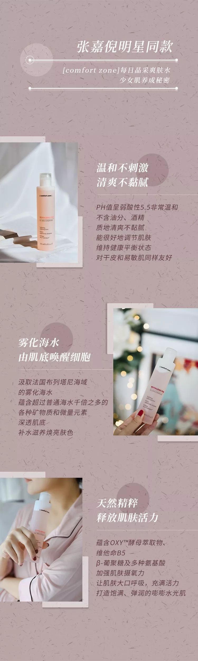 [ comfort zone ]舒适地带是一个源自意大利美学理念,融合尖端科技和天然高效成分,为肌肤健康提供全面方案的护肤品牌。人性化的科学运用在产品中达到“美丽共存”的理念,倡导全面、健康和可持续发展的生活方式。