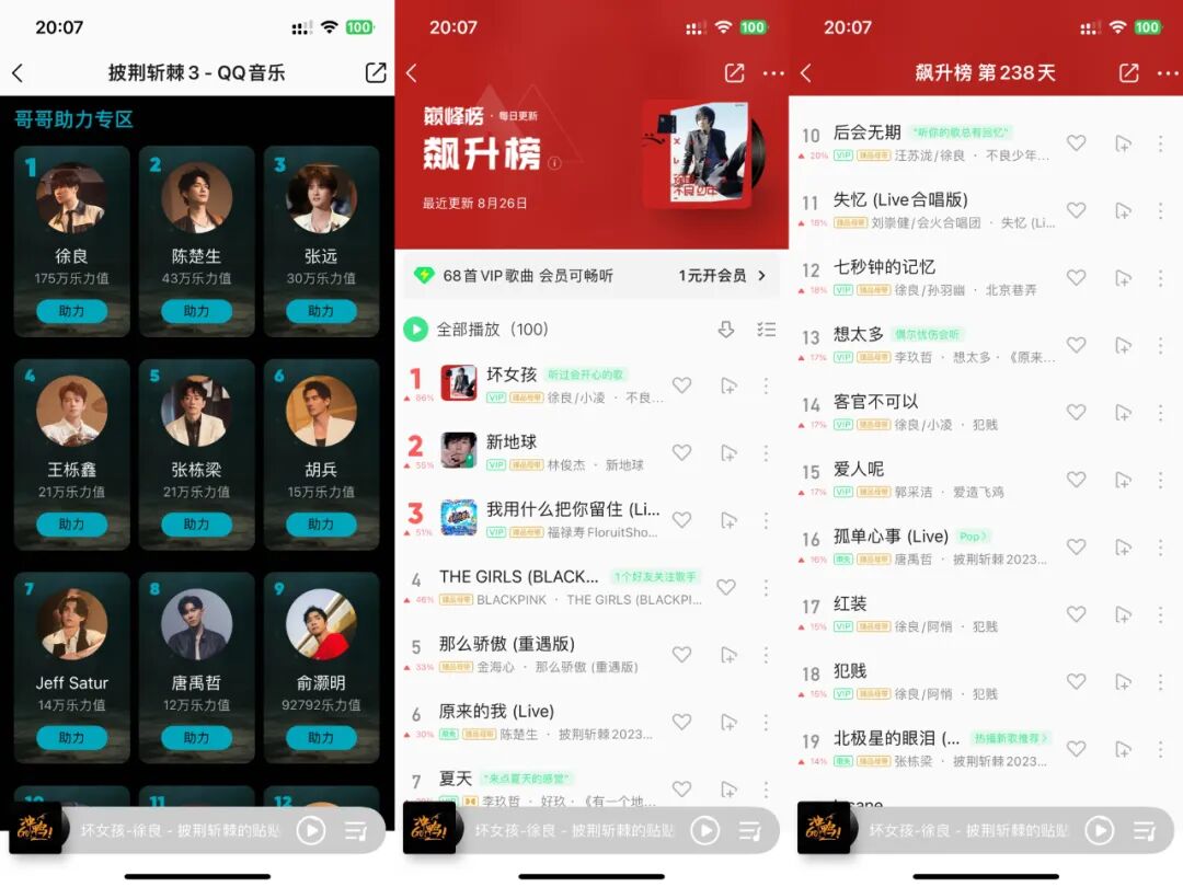 被网友调侃为“主场作战”的QQ音乐平台上,他不仅以超155万的乐力值断层领先,初舞台曲目《坏女孩》还登上飙升榜第一名,《后会无期》《七秒钟的记忆》《客官不可以》《红装》等同样跻身榜单TOP20。“谁的青春没听过几首徐良啊”,网友如是感慨道。