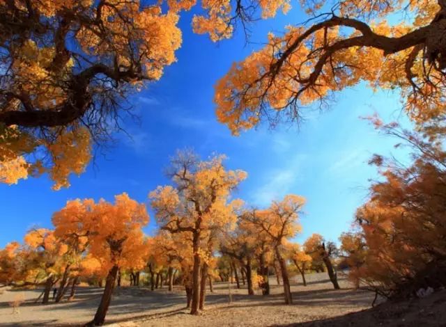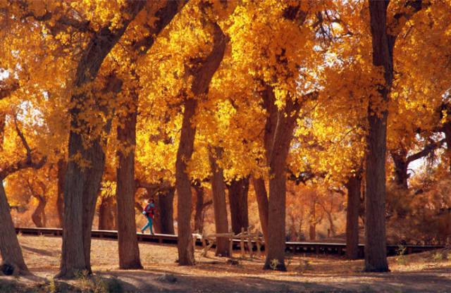 额济纳胡杨林区是世界仅存三处之一,且保护最为完整,每年深秋时节,一派金黄,景色壮美。