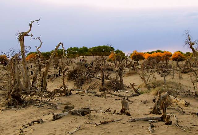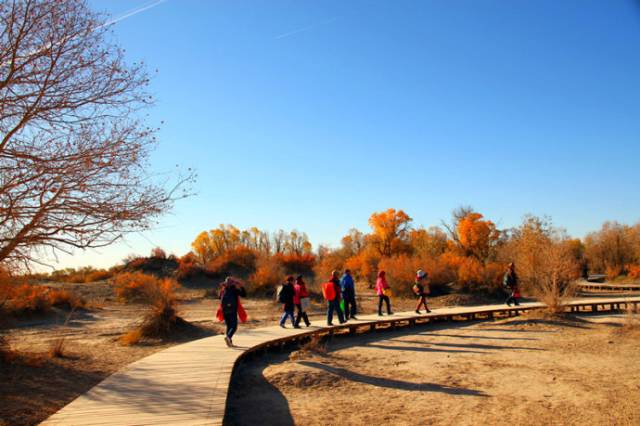 额济纳最火热的时候,也就是深秋季节,那时是胡杨树全面变黄的时候,十多天里,胡杨树叶在霜风之后由绿转为金色的,之后西风横扫,枯叶尽归黄沙,额济纳也随之归于沉寂。