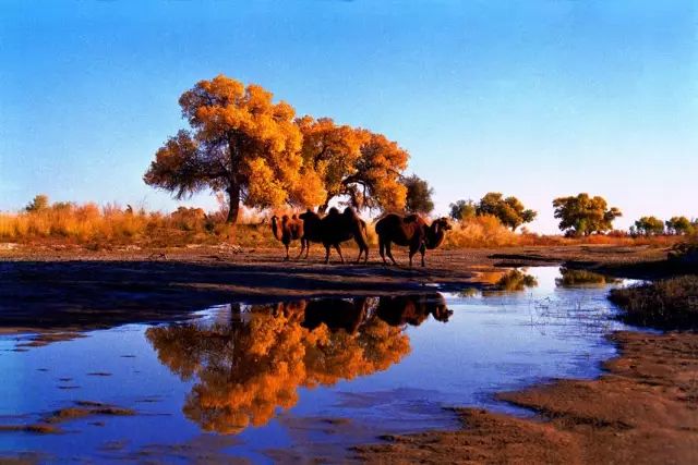 有了水,树便滋润许多,叶子落得慢,虽是黄了,水份足了,色彩也格外艳丽动人,兼之水波澄碧,倒影袅袅,胡杨林的灵韵自非他处可比了。