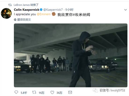 在阿姆的这次表演之后,克利夫兰骑士队的球员勒布朗11日转发了一条前NFL球星科林-卡佩尼克发布的推特,用这种方式向总统特朗普开炮。发出这条推特的卡佩尼克是前旧金山49人队的四分卫,他在推特上写道:“我很欣赏埃米纳姆。”这条推特的内容正是阿姆10月6日在底特律地下车库里的freestyle(即兴说唱)《暴风雨》(storm)的视频,在这段歌词中,阿姆多次炮轰现任总统特朗普,其中不乏大量粗口,“婊子”、“狗屎”、“唐纳德就是一个笑话”,最后还直接吼出了“特朗普”,以此示威。