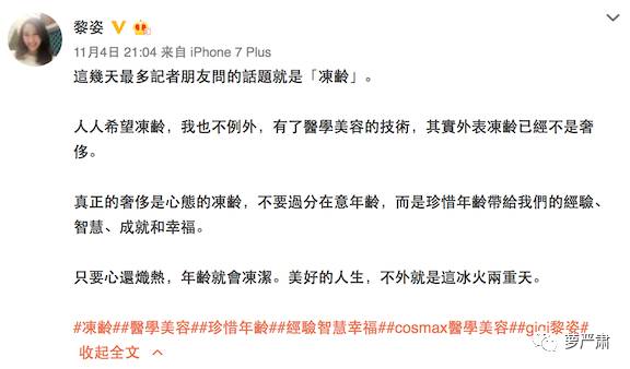 因为她现在做的就是医美生意,所以大概自己不能有皱纹吧,但是她也说了,外表冻龄不是奢侈,真正的奢侈是内心冻龄。