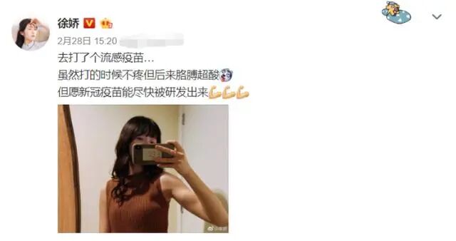 此外,徐娇还透露自己之前已经打了流感疫苗,并希望新型冠状病毒的疫苗也能尽快研发成功。