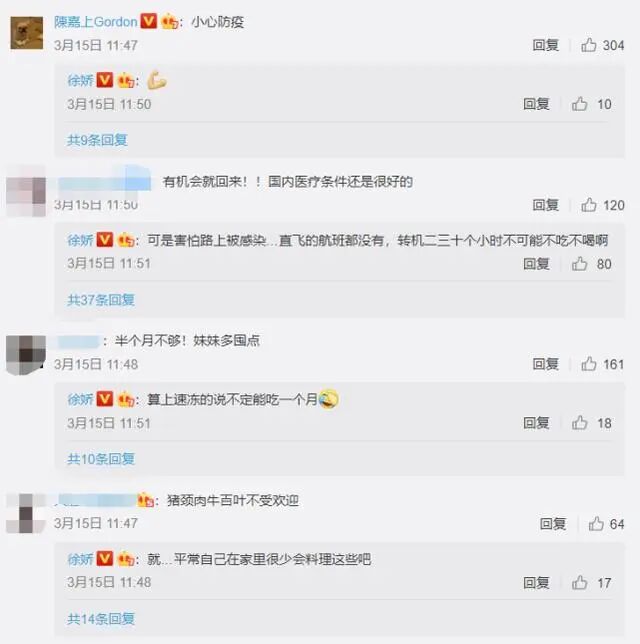 香港导演陈嘉上,在看到徐娇动态后,暖心留言提醒她,身在异乡小心防疫,评论区里的粉丝也纷纷表示担心,提议她有机会就回国。但徐娇坦言自己害怕路上被感染,直飞的航班也都取消,转机二三十个小时不可能不吃不喝,言语中透出焦虑,不少网友纷纷安慰徐娇,并建议她不要出门,好好宅在家里,因为机场跟飞机有更大的染病风险。
