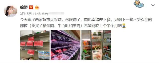 徐娇称自己跑了两家超市大采购,米限购了,肉也卖得差不多,只剩下一些不受欢迎的部位,她买到了猪颈肉、牛百叶和羊肉,还晒出自己囤的满满的冰箱,希望能够自己吃半个月的。