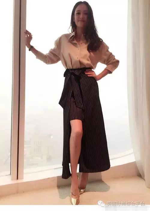 陈乔恩这件衬衫搭配高腰系带的开衩式半裙,收腰的地方很好展现小蛮腰最后开叉的地方也很好的秀一秀美腿。