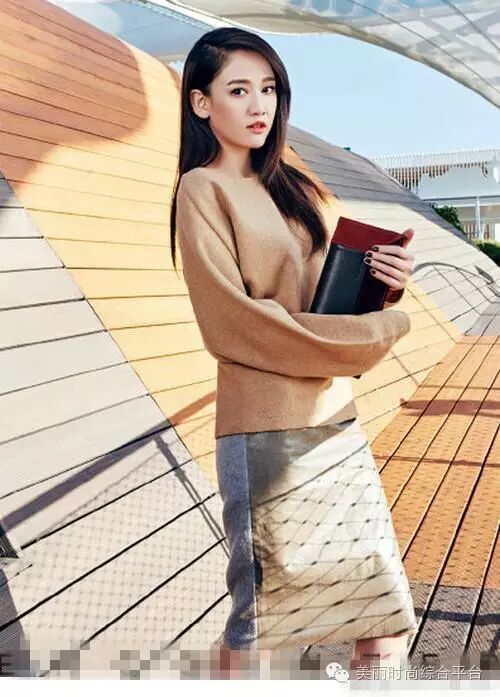这一身宽松的驼色毛衣和金色菱格纹包臀半裙,看起来在帅气随意中多了一点女生的小慵懒,如果觉得这种皮质裙子比较难搭配可以尝试同色系的包臀裙