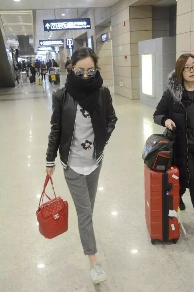 棒球皮夹克配浅灰色米奇卫衣、灰色休闲裤、小白鞋和红色双肩包,感觉真的轻松又时髦。