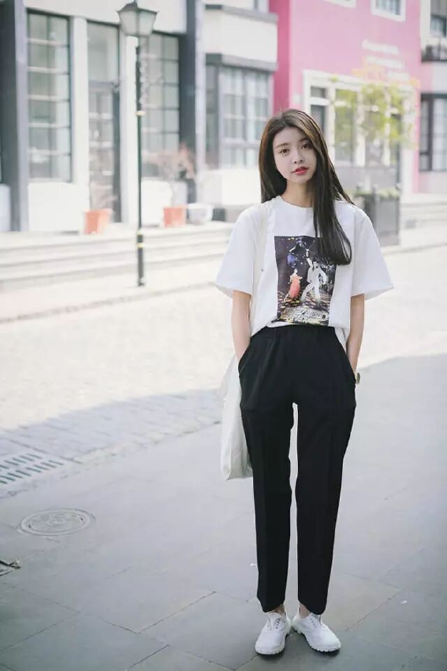 TEE+西装裤+小白鞋 绝对是街头最休闲随性的搭 宽松惬意的同时时髦指数up哦!来点印花也是锦上添花~