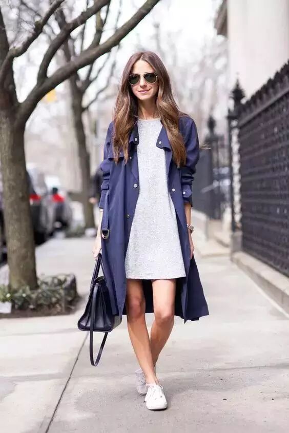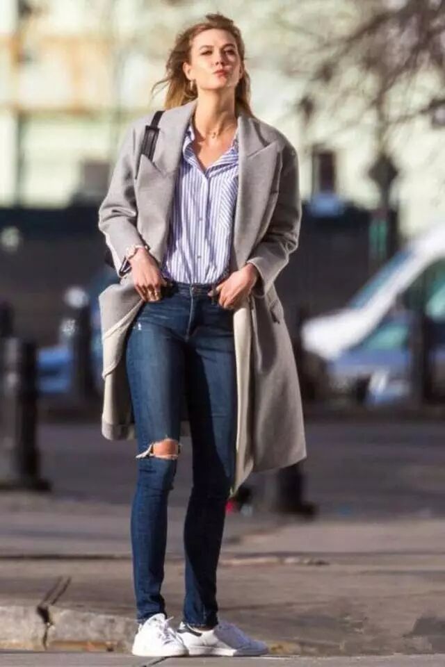 灰色外套配浅蓝色条纹衬衫和牛仔裤、小白鞋,简约干练的造型尽显潇洒范。