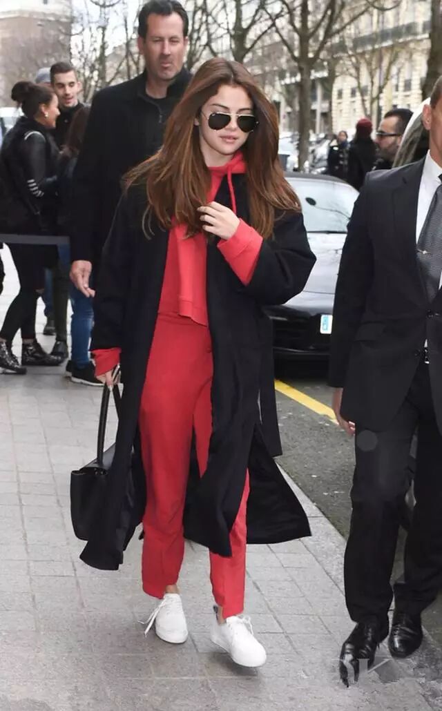 一身红色休闲装,用小白鞋来中和造型颜色,街头味十足也不乏女人味。
