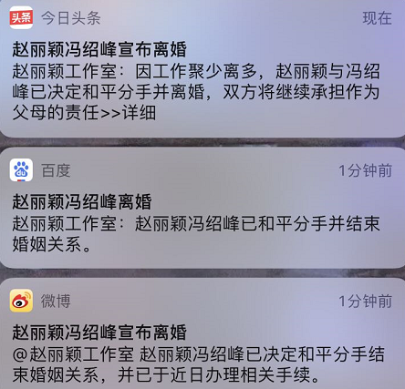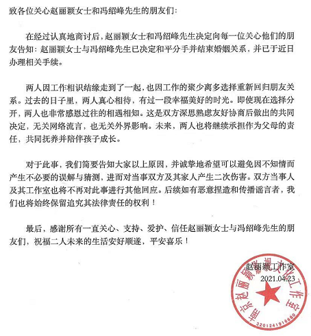 两人的工作室于上午10点同时发布离婚声明,内容如出一辙,无非是抬头顺序做了调换。