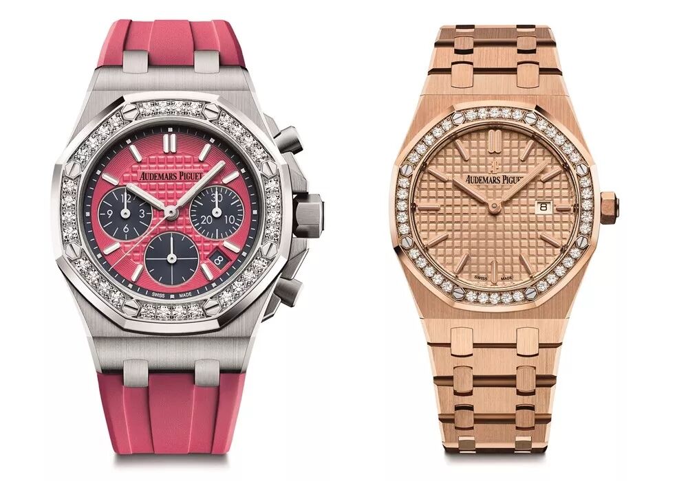 还有两款女表,分别是优雅迷人的皇家橡树离岸型自动上链计时码表,以及18K玫瑰金的皇家橡树系列女装腕表。