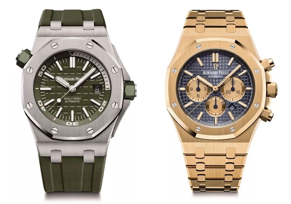 包括两款男表,动感十足的绿色皇家橡树离岸型潜水腕表,以及高贵大方的黄金材质皇家橡树系列自动上链计时码表。