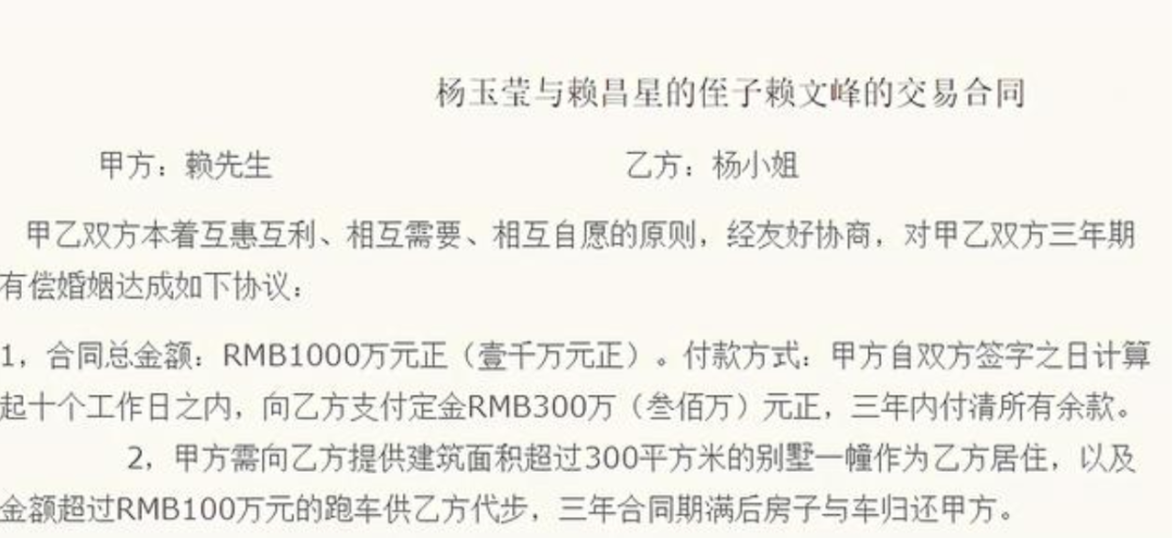 网络上一份关于赖文峰和杨钰莹的婚姻合同疯传。合同内容是,赖文峰向杨钰莹支付1000万,要求杨钰莹三年内无条件听从赖文峰。