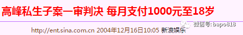 一审判决结果是,高峰每月给私生子1000块直至18岁,一共17万。
