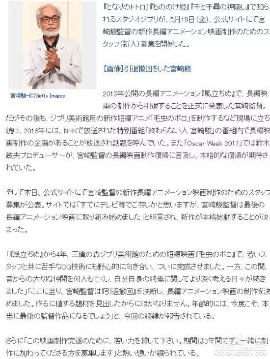 昨天(5月19日)日本媒体正式宣布宫崎骏确定复出,而且宫崎骏本人表示:这次的复出真的是他最后一次复出了。同时吉卜力也开始为宫崎骏最后的长篇动画开始招募制作人员。