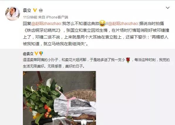 袁立现在是非常热衷和网友“华山论剑”了,前阵子和许晴粉丝互撕。今天,又在微博上点名网友。 有网友说:“当年他和张国立拍戏时生情,被邓婕扇耳光”。袁立看到这条留言后,立马在微博否认: