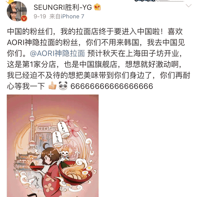 全球最大的BIGBANG拉面馆来上海了,中国首家! 拔草 日韩男星 2017-11-24 14:50:57 463 创作不易,用心坚持,欢迎请BaGua喝几杯爱心咖啡!打赏并支持本文 打赏并删除本文 就是今天!在打浦桥的田子坊!中国首家也是魔都首家bigbang面馆开业啦!!!胜利欧巴用中文写道:“祝愿全世界的人都能吃到美好的Aori拉面!”胜利以后会常常来上海啦!开熏的上天了!bigbang的迷妹在!哪里!1 创作不易,用心坚持,欢迎请BaGua喝几杯爱心咖啡!打赏并支持本文 打赏并删除本文 感谢您的支持鼓励,我会继续努力的!文章地址:用户邮箱:打赏金额:USDT 请输入数字点击”去打赏“,即可进行打赏支持本文章哦 bigbang About the Author 拔草 功能介绍:美食、酒店、展览、攻略,为您拔草品质生活!合作请加:sylsyl0520 Related Posts 火爆东京的「虚.构」展来魔都了!一次要排4h,竟然骗了无数人! 2018-06-19 17:03:36 全球最大的BIGBANG拉面馆来上海了,中国首家! 2017-11-24 14:50:57 发表评论