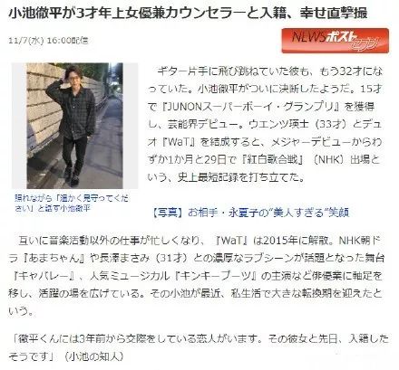 小池澈平已经与比他年长3岁的女演员永夏子结婚