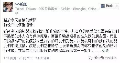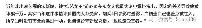 因为前后牵涉了很多朋友,受骗的金额滚雪球般的增加。其中蓝心湄跳出来主动承担了因为她而受骗的朋友们的钱。结果就是矛头直指宋新妮,甚至说到她不仅没还钱,还想骗更多的人的钱来还蓝心湄他们一圈人的受骗钱款。