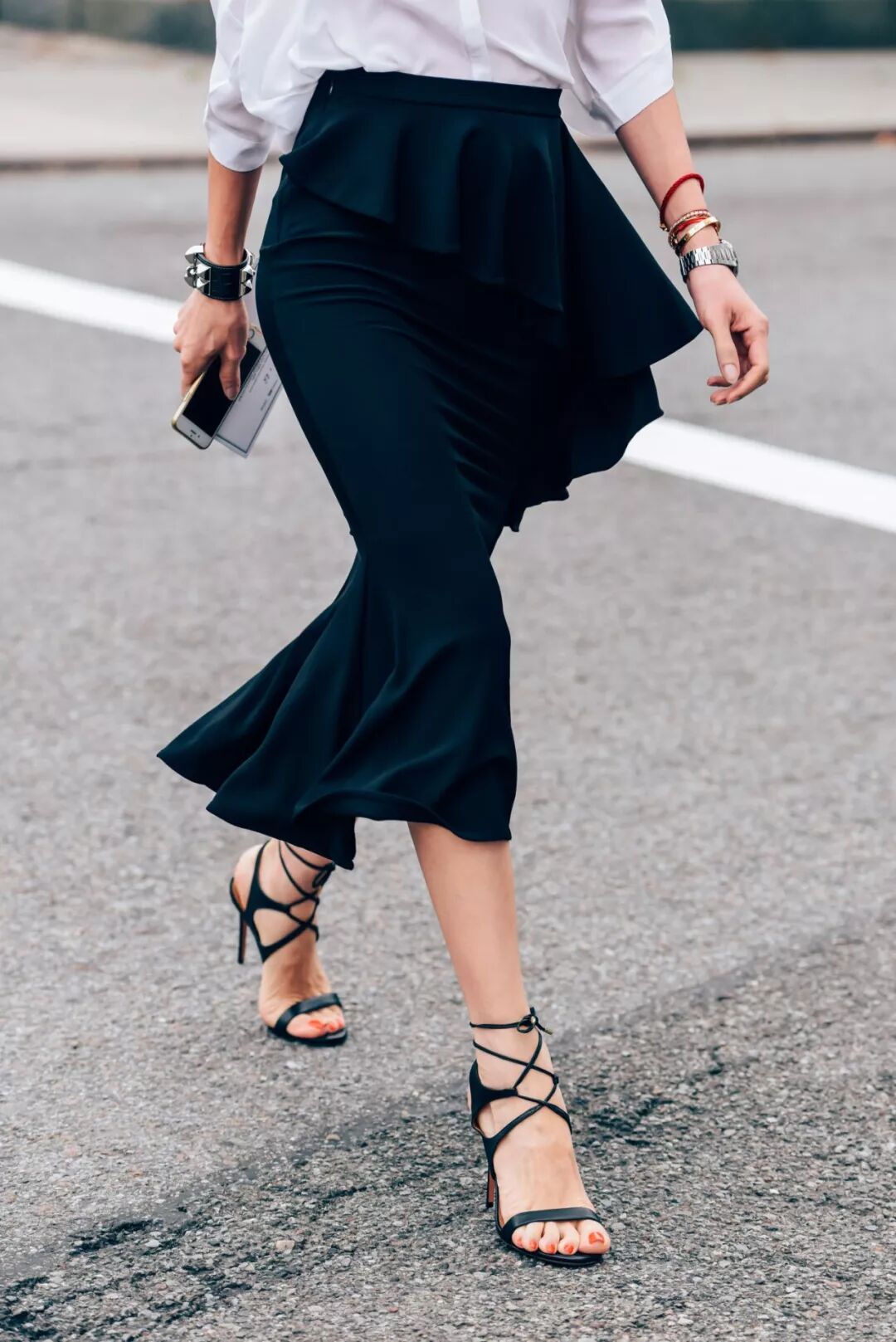 选择细款的绑带能够达到修饰腿型的目的,同时也显得优雅气质。