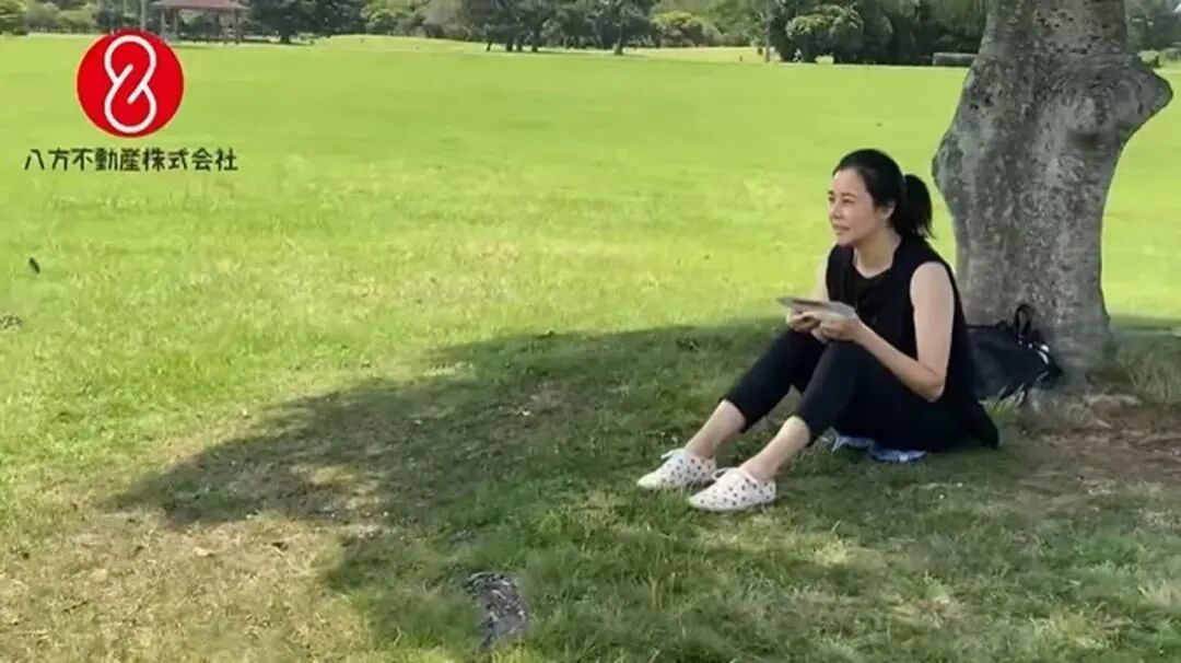 她躺在大树下乘凉,四周全是绿油油的草坪与树木,风景宜人,相当惬意。