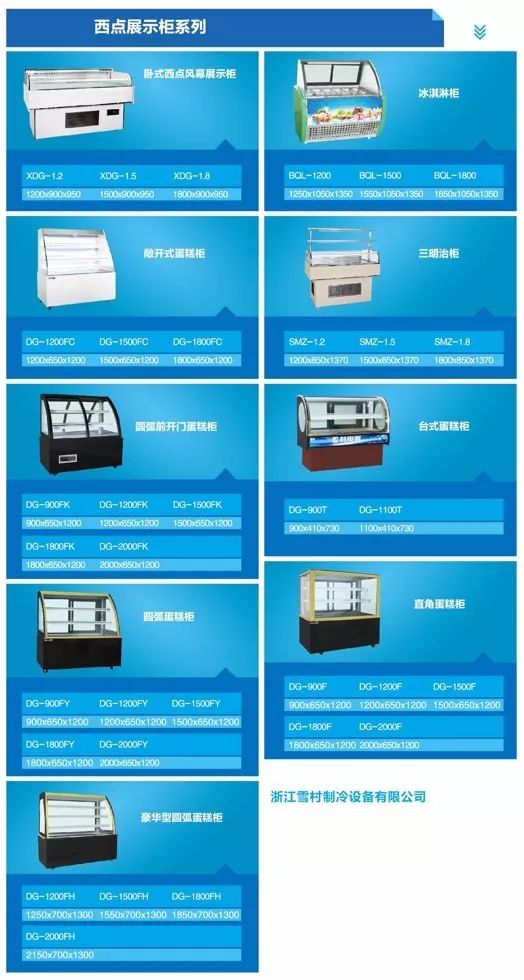 陈列柜,雪糕柜,海鲜柜,岛柜,鲜肉柜,蛋糕柜,风慕柜,冰激凌柜,药品冷藏柜,点菜柜,厨房四门冰箱,工作台,制冰机等,和碗碟消毒柜。并承建大型冷库。