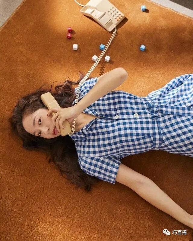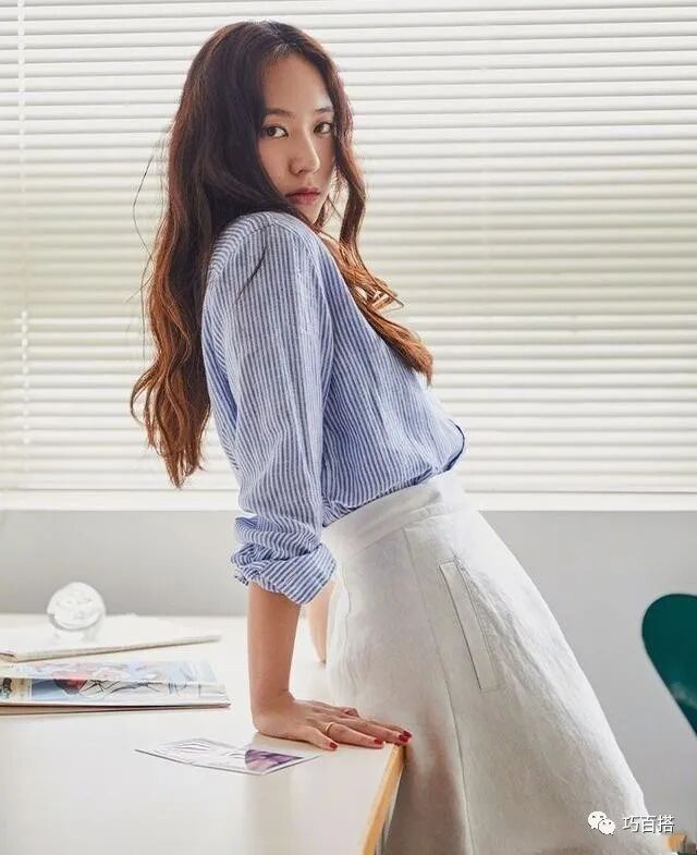 这次拍摄的服装主要以淡蓝色居家服为主,其中包括蓝白格纹连衣裙,蓝白格纹针织开衫,这次又换上了一件蓝白条纹男友风衬衫,和白色墙壁相呼应,有种走在松软的沙滩上吹着咸咸的海风喝着爽口的海盐汽水的感觉,很治愈。外加这条米白色高腰A字裙,直筒高腰的设计挺括有型,凸显腰身。