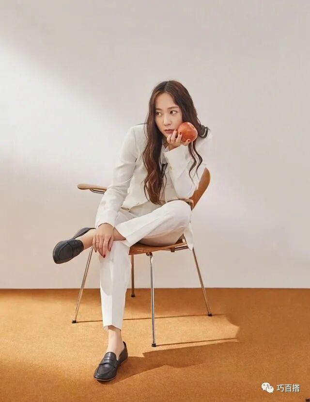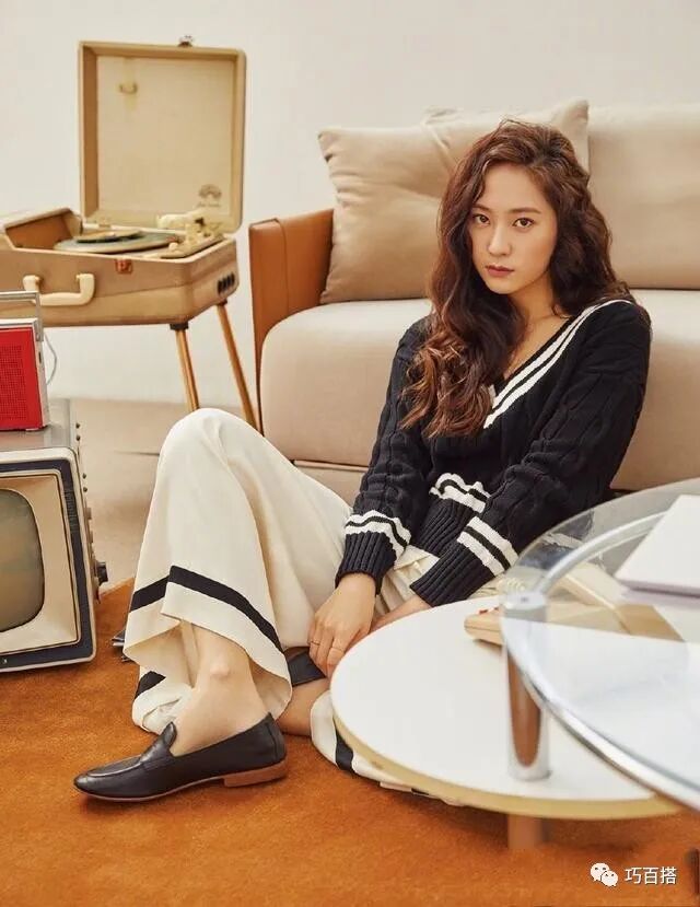郑秀晶这次的大片也改变了以往的形象,26岁的她眼神充满故事,颇有成熟女人的气场,这大概就是早出道的效果吧,就好比范丞丞和易烊千玺是同龄但是完全看不出来的感觉一样,早熟的人真的很有大佬范。深蓝色V字领针织衫搭配米白色拖地直筒裤,这就给我们提了一个醒,不是所有的杂志都是天马行空不切实际的,欧尼这身穿搭就值得借鉴。深蓝色针织衫上有白色条纹,米白色阔腿裤上有深蓝色条纹,上下对比,整体性特别强。